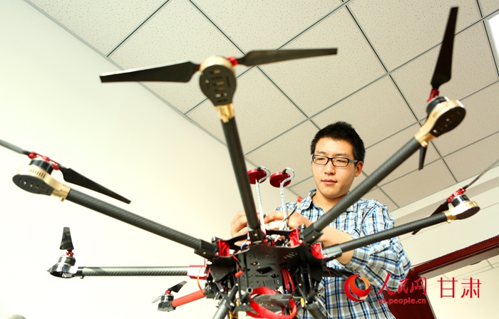 Yang installs signal receiver to an UAV on May 11, 2015. (People’s Daily Online/Mu Jian)