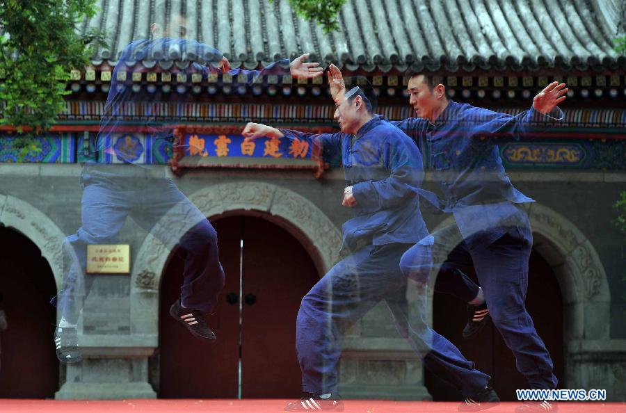 This multi-exposure photo shows a participant performing Taichi during a Taichi national contest in Beijing, capital of China, May 15, 2015. (Xinhua/Gong Lei)