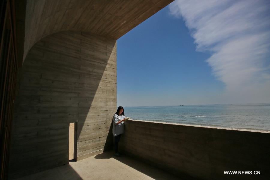 A woman reads a book at the seaside public library in Qinhuangdao, north China's Hebei Province, May 14, 2015. Situated on the seafront of Qinhuangdao, the newly-built library opened its door recently. Standing alone on an empty beach, the 450-square-meter library was called "the loneliest library" by Chinese netizens and became a hot topic quickly. Designed by an architect named Dong Gong, the two-story library creates a peaceful sea view for readers. (Xinhua/Yang Shiyao)