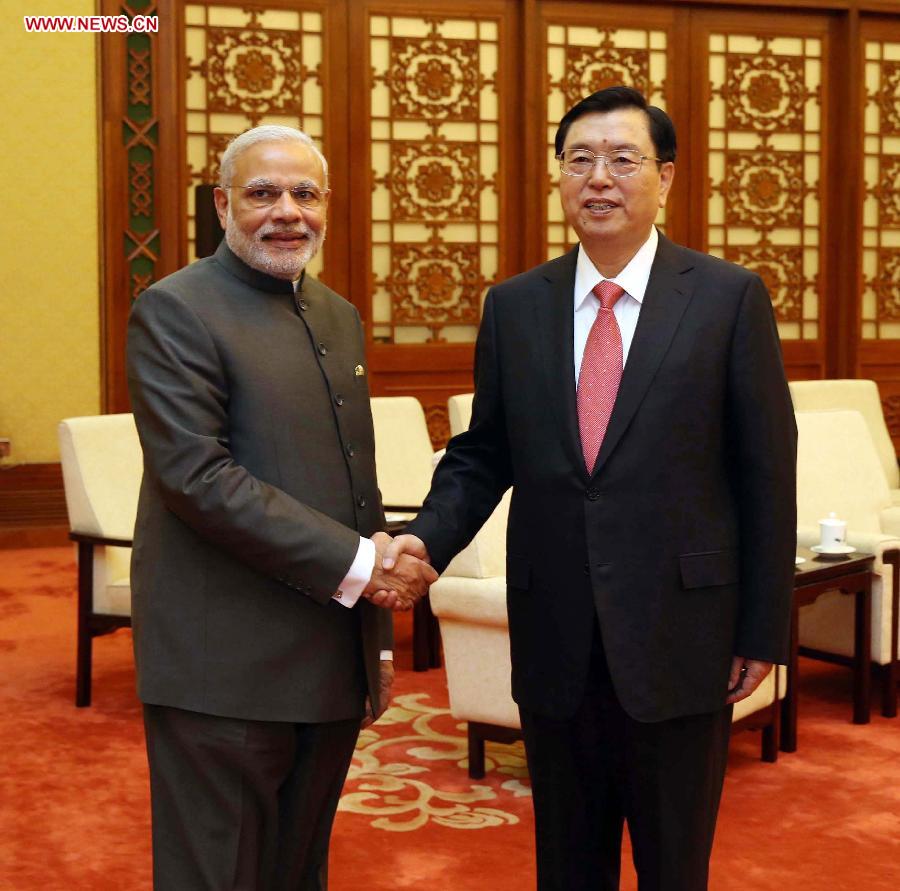 Zhang Dejiang (R), chairman of the Standing Committee of China's National People's Congress (NPC), meets with Indian Prime Minister Narendra Modi in Beijing, capital of China, May 15, 2015. (Xinhua/Liu Weibing)