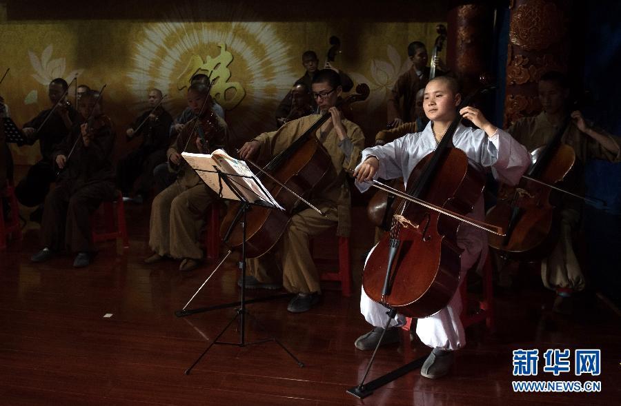 Located in central China’s Hubei province, Tiantai Temple is famous for its Buddhist music. Young Buddhist monks and nuns play beautiful music with violins, cellos, pianos and other instruments. Playing Buddhist music is their way of self-cultivation. In 2008, Tiantai Temple formed its own band – Guangxuan Art Troupe, which now has over 40 members. The band is often invited to perform music and spread Buddhism outside the temple. (Xinhua/Cheng Min)