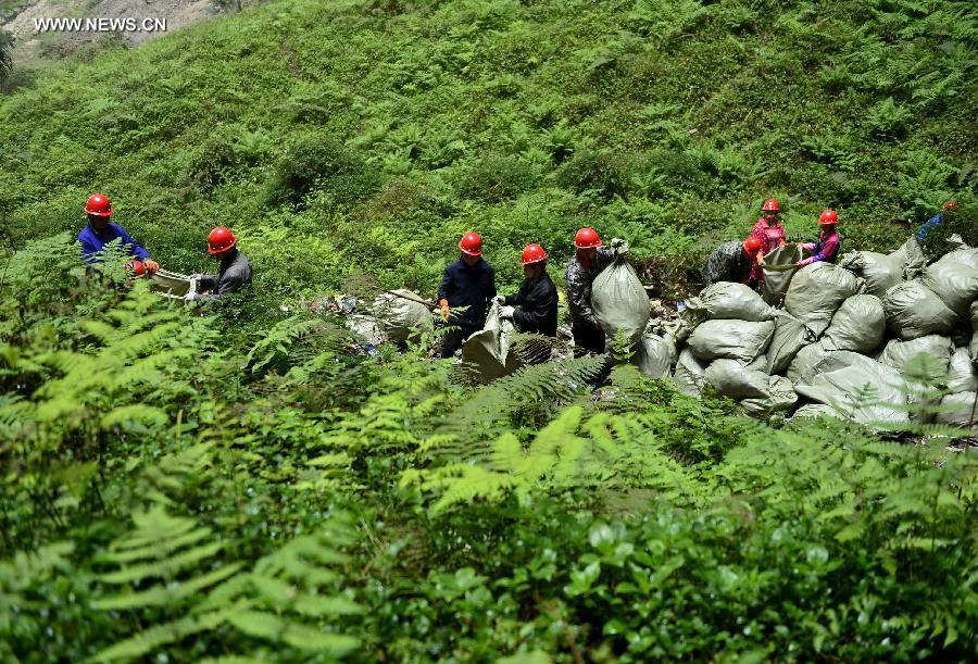 | Workers clear the rubbish in a Tiankeng, a Karst landform, at Luoquanyan Village of Xuan'en County, central China's Hubei Province, May 15, 2015. Dozens of workers started to clear the rubbish out of the over 290-meter-deep Tiankeng, which was used as a refuse dump, since January this year. A local enterprise invests several million yuan on the rubbish clearance with an aim to restore the ecological system in the Tiankeng and to develop it into an integrated scenic spot of expedition, leisure and geologic sightseeing. (Xinhua/Song Wen) |