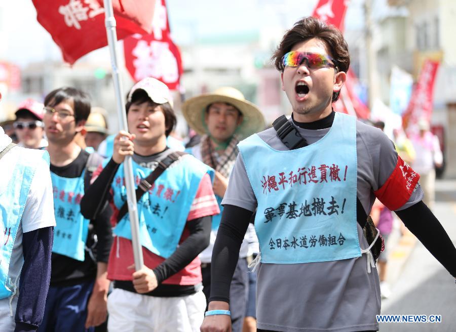 People take part in the anti-U.S. military bases demonstration, in Ginowan city, Japan, on May 16, 2015. The anti-U.S. military bases demonstration continued for the second day on Saturday as protestors from many other prefectures joining hands with Okinawa people marched around the controversial U.S. Futenma airbase in Ginowan city at the Japanese island prefecture. (Xinhua/Liu Tian)