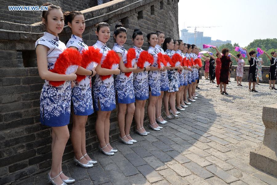 Cheongsam lovers present cheongsams, a traditional Chinese women's dress also known as Qipao, during a cheongsam show in Handan, north China's Hebei Province, May 16, 2015. Sponsored by China Qipao Society, a worldwide cheongsam show was held Saturday, wi