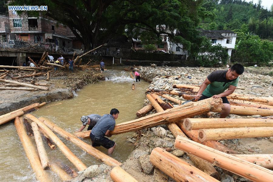 People collect wood of a timber mill destroyed by flood at Sanfang Township of Rongshui County, south China's Guangxi Zhuang Autonomous Region, May 16, 2015. Heavy rains in the region have left at least four people dead and five missing. Local governments have evacuated more than 2,400 people. The rain also toppled 152 houses and damaged nearly 700, leading to surging waters in 12 main rivers of Guangxi and blocked traffic in remote regions. (Xinhua/Li Bin)