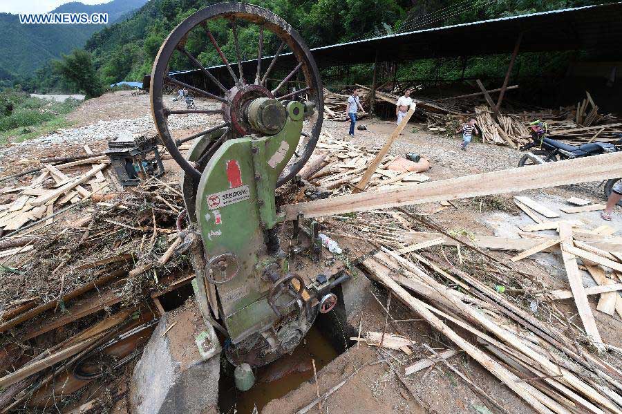 A timber mill is destroyed by flood at Sanfang Township of Rongshui County, south China's Guangxi Zhuang Autonomous Region, May 16, 2015. Heavy rains in the region have left at least four people dead and five missing. Local governments have evacuated more than 2,400 people. The rain also toppled 152 houses and damaged nearly 700, leading to surging waters in 12 main rivers of Guangxi and blocked traffic in remote regions. (Xinhua/Li Bin)