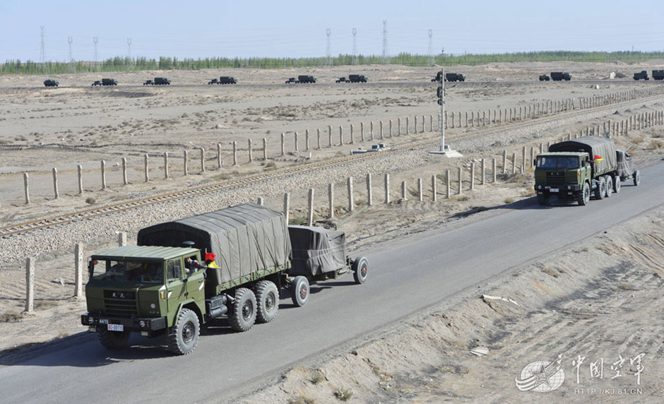 Antiaircraft guns fire a salvo at "enemies" in a drill. In early May 2015, an air defense regiment of Beijing Military Region successfully conducts a day and night maneuvering drill in the desert in northwest China. (Photo source: kj.81.cn)