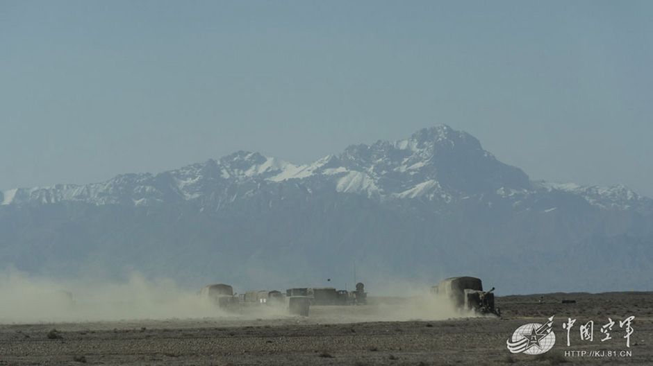 Antiaircraft guns fire a salvo at "enemies" in a drill. In early May 2015, an air defense regiment of Beijing Military Region successfully conducts a day and night maneuvering drill in the desert in northwest China. (Photo source: kj.81.cn)