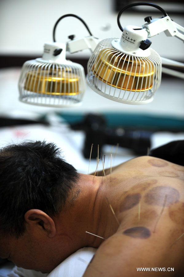 File photo taken on March 14, 2011 shows a patient receiving acupuncture treatment in a hospital in Liangzhou, northwest China's Gansu Province. Acupuncture and moxibustion are forms of traditional Chinese medicine widely practised in China and also found in regions of south-east Asia, Europe and the Americas. They are among the most widely practiced Chinese therapies in the country and is gaining increasing popularity in the West. The theories of acupuncture and moxibustion hold that the human body acts as a small universe connected by channels, and that by physically stimulating these channels the practitioner can promote the human body's self-regulating functions and bring health to the patient. This stimulation involves the burning of moxa (mugwort) or the insertion of needles into points on these channels, with the aim to restore the body's balance and prevent and treat disease. In acupuncture, needles are selected according to the individual condition and used to puncture and stimulate the chosen points. Currently, acupuncture sections were set up in all Chinese Medicine hospitals, which now number 2,000 all over China. It now can be applied to different systems inside the human body. In addition,much valuable information have been obtained in the study of acupuncture, in its regulative function, in easing pain, in developing the immunity system, and in the study of human channels, acupuncture points, and internal organs. It was listed as an intangible cultural heritage of humanity by the UNESCO in 2010. Moxibustion is usually divided into direct and indirect moxibustion, in which either moxa cones are placed directly on points or moxa sticks are held and kept at some distance from the body surface to warm the chosen area. Moxa cones and sticks are made of dried mugwort leaves. Acupuncture and moxibustion are taught through verbal instruction and demonstration, transmitted through master-disciple relations or through members of a clan. Currently, acupuncture and moxibustion are also transmitted through formal academic education. (Xinhua/NieJianjiang)