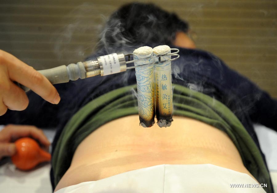 File photo taken on Sept. 29, 2010 shows a tourist experiencing moxibustion treatment at Expo Park in Shanghai, east China. Acupuncture and moxibustion are forms of traditional Chinese medicine widely practised in China and also found in regions of south-east Asia, Europe and the Americas. They are among the most widely practiced Chinese therapies in the country and is gaining increasing popularity in the West. The theories of acupuncture and moxibustion hold that the human body acts as a small universe connected by channels, and that by physically stimulating these channels the practitioner can promote the human body's self-regulating functions and bring health to the patient. This stimulation involves the burning of moxa (mugwort) or the insertion of needles into points on these channels, with the aim to restore the body's balance and prevent and treat disease. In acupuncture, needles are selected according to the individual condition and used to puncture and stimulate the chosen points. Currently, acupuncture sections were set up in all Chinese Medicine hospitals, which now number 2,000 all over China. It now can be applied to different systems inside the human body. In addition,much valuable information have been obtained in the study of acupuncture, in its regulative function, in easing pain, in developing the immunity system, and in the study of human channels, acupuncture points, and internal organs. It was listed as an intangible cultural heritage of humanity by the UNESCO in 2010. Moxibustion is usually divided into direct and indirect moxibustion, in which either moxa cones are placed directly on points or moxa sticks are held and kept at some distance from the body surface to warm the chosen area. Moxa cones and sticks are made of dried mugwort leaves. Acupuncture and moxibustion are taught through verbal instruction and demonstration, transmitted through master-disciple relations or through members of a clan. Currently, acupuncture and moxibustion are also transmitted through formal academic education. (Xinhua/Guo Xulei)