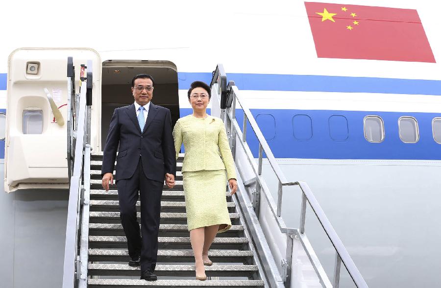 Upon his arrival, Li and his wife, Prof. Cheng Hong, walked down the ramp hand in hand, and were greeted by Irish Finance Minister Michael Noonan, Chinese Ambassador Xu Jianguo and others.