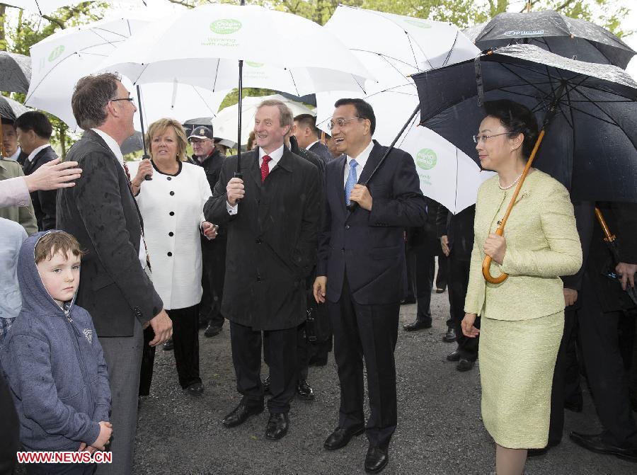 | Chinese Premier Li Keqiang (2nd R) and his wife, Prof. Cheng Hong (1st R), in the company of Irish Prime Minister Enda Kenny (3rd R) and his wife Fionnuala O'Kelly, visit Garvey's Farmhouse, a typical Irish family-run cow farm in Shannon, Ireland, May 17, 2015.(Xinhua/Huang Jingwen) |