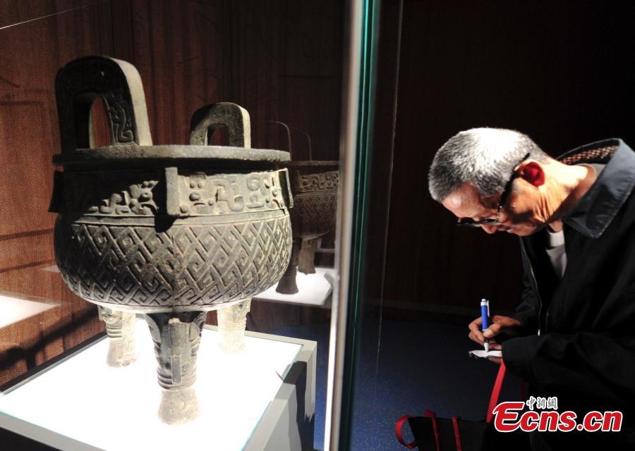 Visitors view cultural relics at an exhibition to mark International Museum Day in Jinan city, capital of East China’s Shandong province, May 18, 2015. Some 319 centerpieces from the province’s 25 museums, including pottery, porcelain, jade works, calligraphy, sculpture, and seal stamps used by author Pu Songling (1640-1715), were on display in the exhibition. (Photo: China News Service/Zhang Yong)