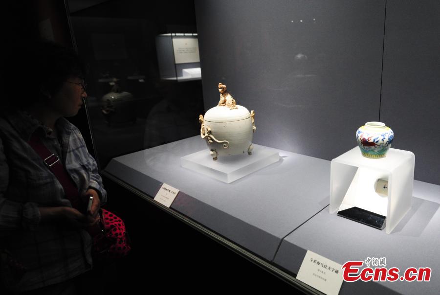 | Visitors view cultural relics at an exhibition to mark International Museum Day in Jinan city, capital of East China’s Shandong province, May 18, 2015. Some 319 centerpieces from the province’s 25 museums, including pottery, porcelain, jade works, calligraphy, sculpture, and seal stamps used by author Pu Songling (1640-1715), were on display in the exhibition. (Photo: China News Service/Zhang Yong) |