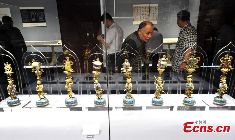Visitors view cultural relics at an exhibition to mark International Museum Day in Jinan city, capital of East China’s Shandong province, May 18, 2015. Some 319 centerpieces from the province’s 25 museums, including pottery, porcelain, jade works, calligraphy, sculpture, and seal stamps used by author Pu Songling (1640-1715), were on display in the exhibition. (Photo: China News Service/Zhang Yong)