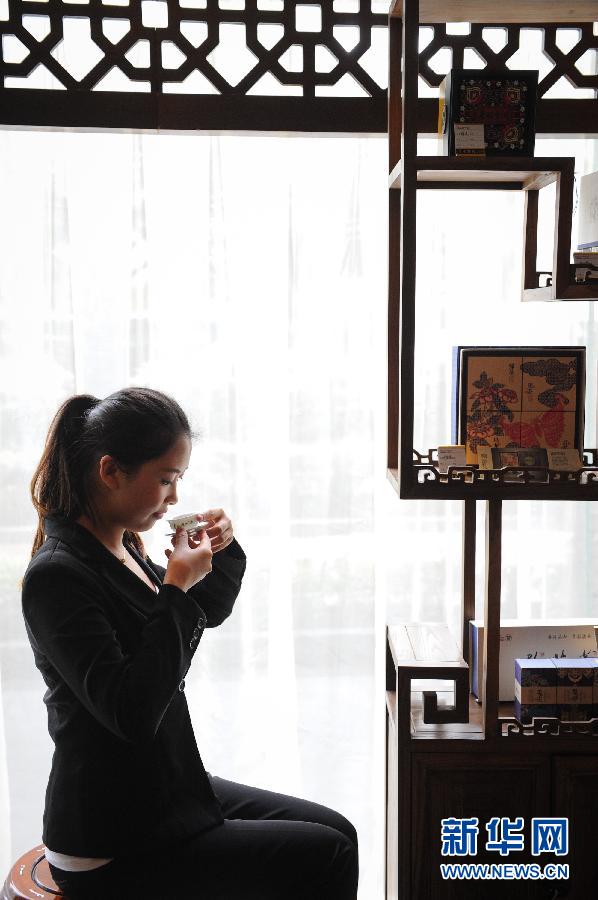 Xiao Xiaoyan drinks tea in a five-star hotel in Guiyang, May 13, 2015. (Xinhuanet/Ou Dongqu)