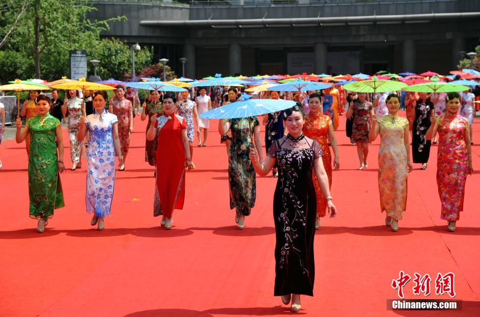 Women stage a Cheongsam show in east China's Anhui Province, May 16, 2015. (CNS/Zhai Yujia)