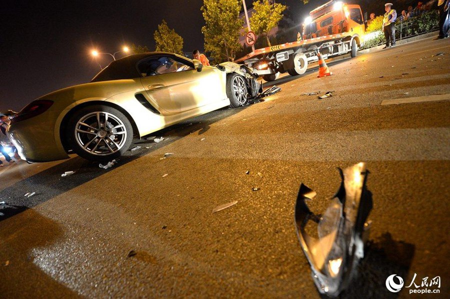| A Porsche crashes into a sanitation garbage truck in Jinan, east China's Shandong province on the evening of May 18. (CFP/Wen Lu) |