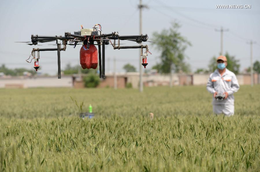 A drone flies over a wheat field to spray insecticide at Wenjiazhuang Village in Shijiazhuang, north China's Hebei Province, May 19, 2015. One insecticide spraying drones can cover 15 to 20 hectres of wheat field in eight hours, significantly saving costs compared with traditional methods. (Xinhua/Wang Xiao)