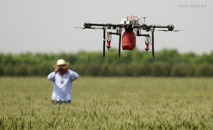 | A drone flies over a wheat field to spray insecticide at Wenjiazhuang Village in Shijiazhuang, north China's Hebei Province, May 19, 2015. One insecticide spraying drones can cover 15 to 20 hectres of wheat field in eight hours, significantly saving costs compared with traditional methods. (Xinhua/Wang Xiao) |