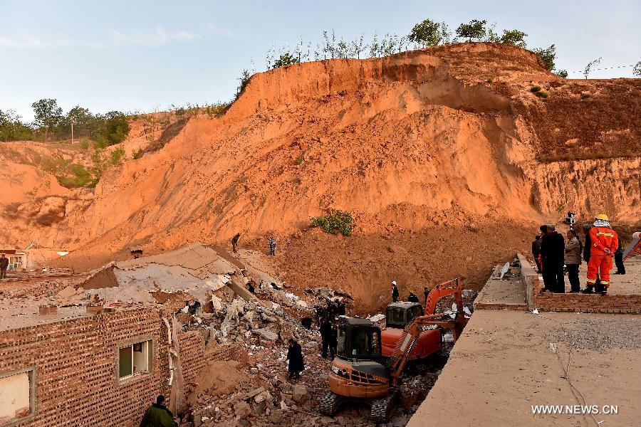 Rescuers search for the missing in the rubble at Yimin New Village of Tuban Town in Linxian County, north China's Shanxi Province, May 20, 2015. Four people were dead and four others missing in a landslide of a loess hill burst burying four farmers' houses Tuesday evening. (Xinhua/Zhan Yan)