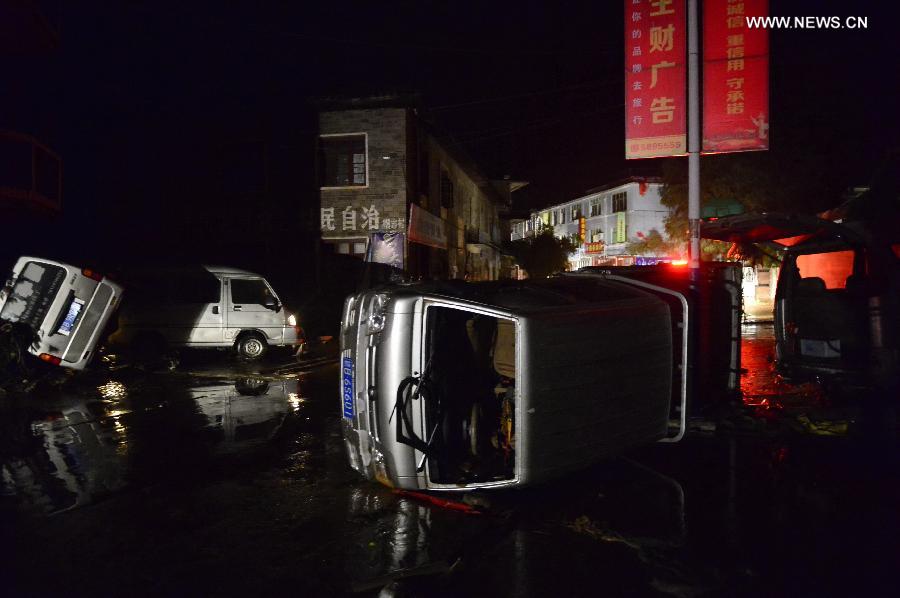 Overturned vehicles are seen in Hengjiang Town of Shicheng County, east China's Jiangxi Province, May 19, 2015. Seven people have been killed in landslides and house collapses caused by torrential rain in Jiangxi since Monday. The downpour has flooded 13,810 hectares of farmland, and destroyed hundreds of homes, forcing almost 10,000 to leave their homes. (Xinhua/Zhou Mi)