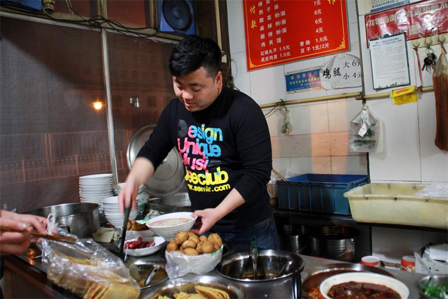 Zheng Haitao is a cafe owner, selling rice noodles for the last four years. His working hours are from 8 p.m. to 8 a.m. On average, he can sell more than 100 bowls of rice noodles a night.