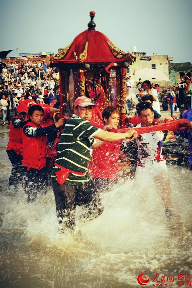 Followers of Mazu participate in the waterway ceremony for the sea goddess to inspect her jurisdiction areas and bless worshippers. (Photo/people.cn)