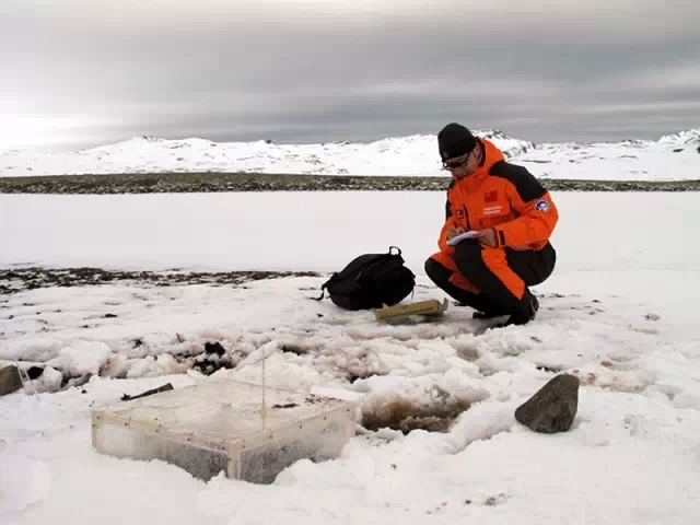Ardley Island is home to penguins. As the tide ebbs, the scientists at the Antarctic Great Wall Station collect the penguin excrement.