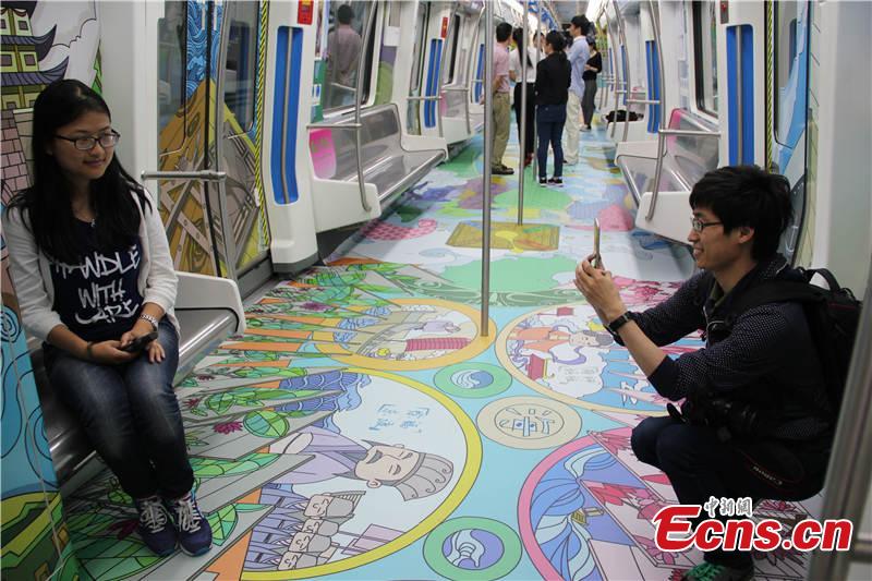 A subway train themed with Maritime Silk Road culture runs in Ningbo city, East China’s Zhejiang province, May 20, 2015. The train mainly uses cartoons and paintings to illustrate the ancient voyage route that connected Ningbo with many cities in other countries. Many people have taken the train to take pictures or better understand the region's history. (Photo: China News Service/Lin Bo)