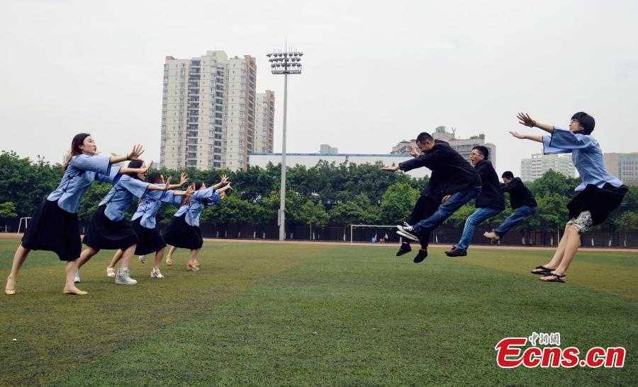 Graduates dress in Chinese costumes popular in early last century and pose for photos at a university in Southwest China’s Chongqing municipality. (Photo: China News Service/Chen Qiuxing)