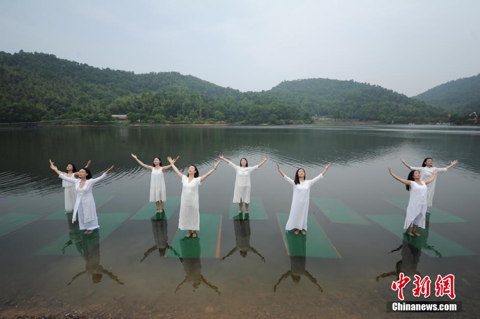 Several beauties perform Yoga on water in Shiyan Lake in Changsha, central China's Hunan province on May 20, 2015. (CNS/Yang Huafeng)
