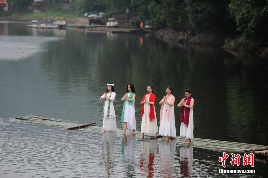 Several beauties perform Yoga on water in Shiyan Lake in Changsha, central China's Hunan province on May 20, 2015. (CNS/Yang Huafeng)
