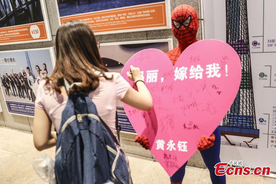 Huang Yongyu, dressed like Spiderman, collects signatures in support of him proposing to his girlfriend in Guangzhou city, capital of South China’s Guangdong province, May 20, 2015. Huang met his girlfriend, who goes by the user name Mary, on a dating app six months ago and decided to pop the big question on May 20, a contemporary local Valentine's Day chosen mainly for its phonetic similarities to the Chinese for "I love you". Huang wanted to collect 520 signatures to support his decision. (Photo: China News Service/Shi Yong)