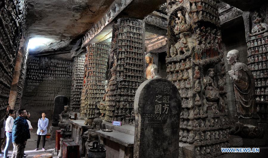 People visit a grotto in Anding Town of Zichang County, northwest China's Shaanxi Province, May 20, 2015. The 1,600-year-old Anding Town has well-preserved Zhongshan Mountain Grottoes and other architectures of ancient times. (Xinhua/Tao Ming)