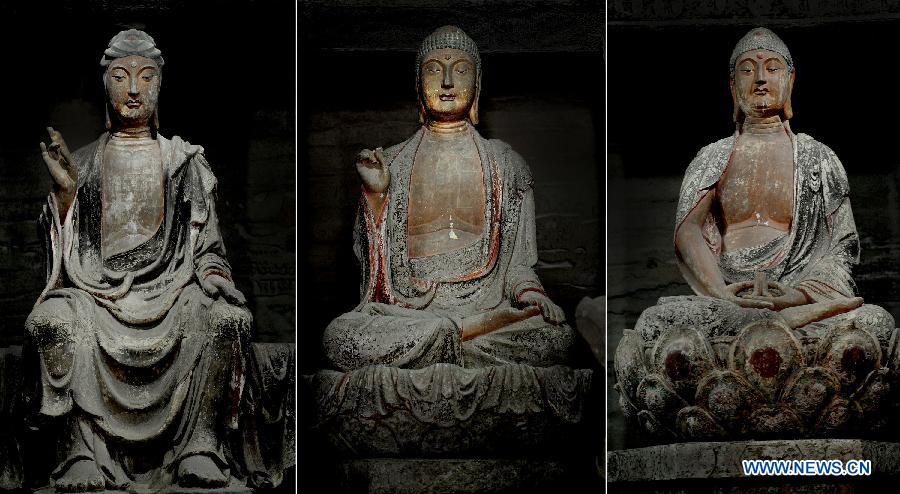 Combo photo taken on May 20, 2015 shows Sakyamuni Buddhas of the three periods coming in sucession past, present and future (L-R) in a grotto in Anding Town of Zichang County, northwest China's Shaanxi Province. The 1,600-year-old Anding Town has well-preserved Zhongshan Mountain Grottoes and other architectures of ancient times. (Xinhua/Tao Ming)
