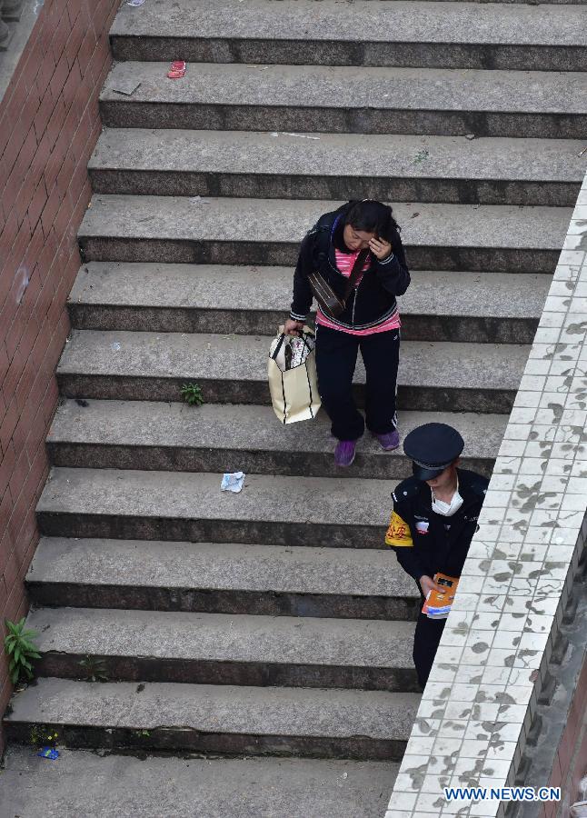 | A policeman escorts a resident back home near a building collapse site in Guiyang, capital of southwest China's Guizhou Province, May 21, 2015. Five bodies were found in the rubble of a collapsed building in central Guiyang Thursday. The accident happened on Wednesday, when the nine-story building with 114 residents living in it fell down. (Xinhua/Liu Xu) |