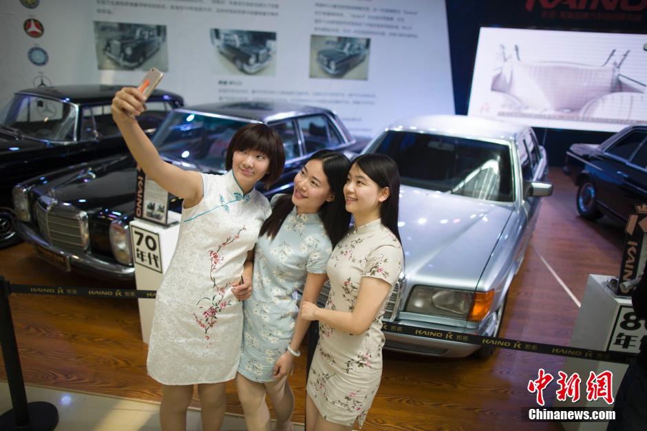 Upon graduation, a group of university students dressed in cheongsams pose for photos at an auto show in Taiyuan, north China's Shanxi Province.(Chinanews.com/Zhang Yun)
