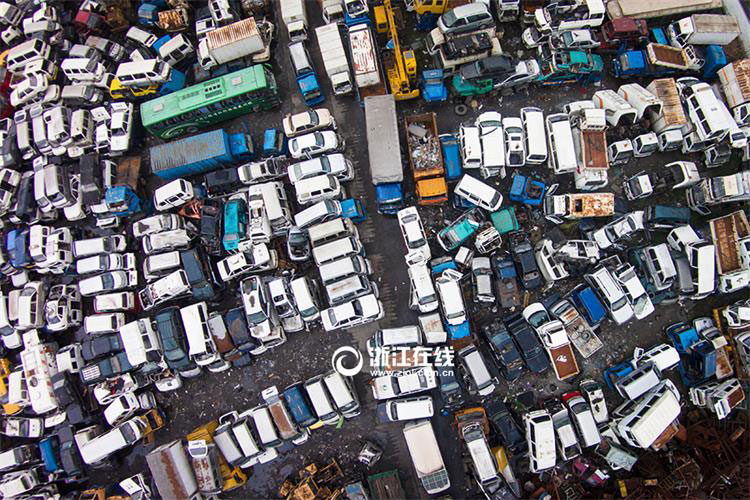 The scrapped cars stored in the motor scrap recycling plant near Hangzhou Iron and Steel Group Company.(Photo/zjol.com.cn)