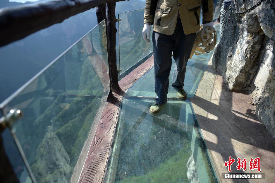 A litter picker walks on the skywalk.(Photo/Chinanews.com)