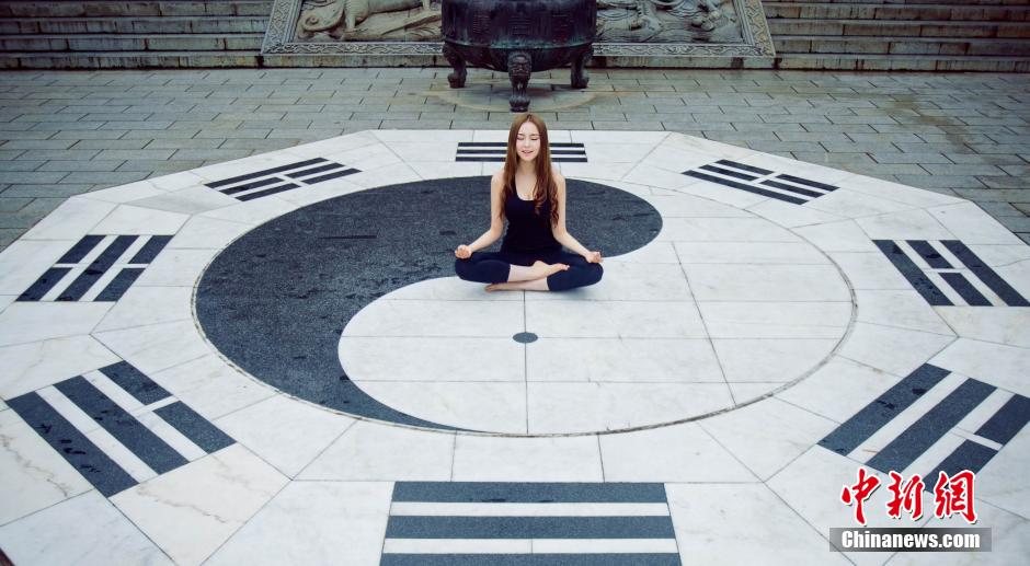 Fu Jiamei, the campus belle of Beijing Sport University, does tai chi and performs Yoga in the Longhu Mountain. (CNS/Yu Kai)