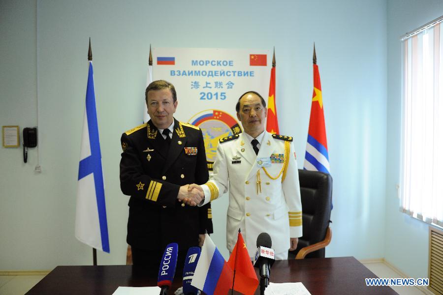 | Du Jingchen(R), deputy commander of the Navy of the People's Liberation Army of China shakes hands with Alexander Fedotenkov, deputy commander of the Russian Navy during a joint press conference in Novorossiysk, Russia, on May 21, 2015. Chinese and Russian naval forces on Thursday ended their joint military exercises in the Mediterranean, according to an online news briefing from the Chinese Defense Ministry. (Xinhua/Dai Tianfang) |