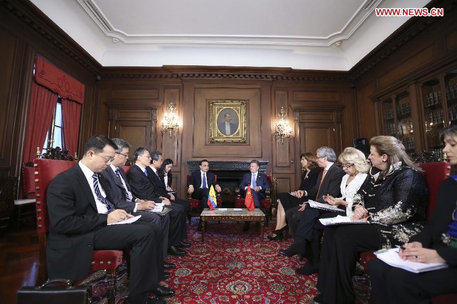 Chinese Premier Li Keqiang (L Back) holds talks with Colombian President Juan Manuel Santos (R Back) in Bogota, capital of Colombia, May 21, 2015. (Xinhua/Ding Lin)