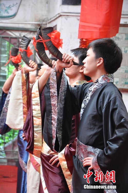 A Han style group wedding is held in a family temple in Rucheng, central China’s Hunan province on May 20, 2015. Wearing traditional Han costumes, 10 couples performed the ancient Han wedding ceremonies. (Chinanews/Lu Yi)