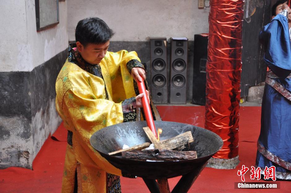 A Han style group wedding is held in a family temple in Rucheng, central China’s Hunan province on May 20, 2015. Wearing traditional Han costumes, 10 couples performed the ancient Han wedding ceremonies. (Chinanews/Lu Yi)