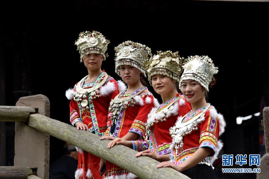 Tourists pose for a group photo in ethnic clothes in a Dong village in Sanjiang Dong Autonomous County, southwest China's Guangxi Zhuang Autonomous Region, May 19, 2015. Tuesday is China's fifth National Tourism Day. Many scenic spots have taken certain measures and offered discounts to attract more tourists. (Xinhua/Wu Lianxun)