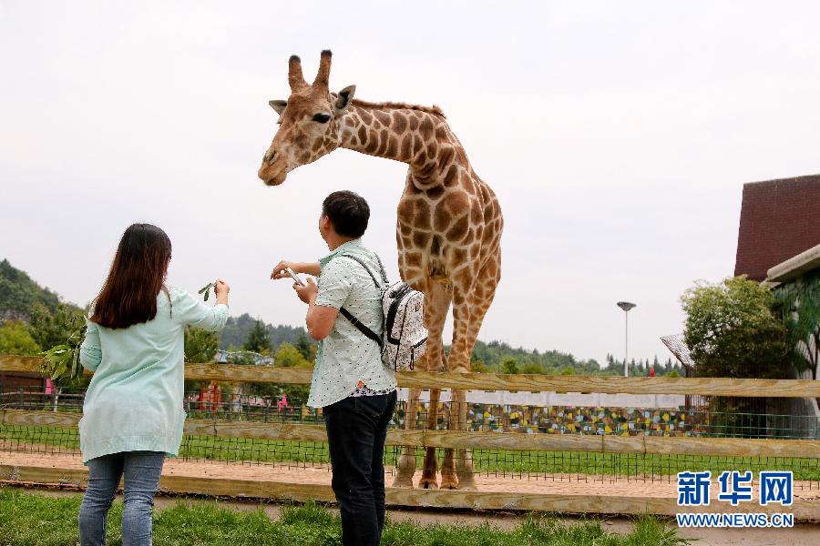 Tourists interact with a giraffe in Guiyang Safari, southwest China's Guizhou province, May 19, 2015. Tuesday is China's fifth National Tourism Day. Many scenic spots have taken certain measures and offered discounts to attract more tourists. (Xinhua/Zhang Hui)