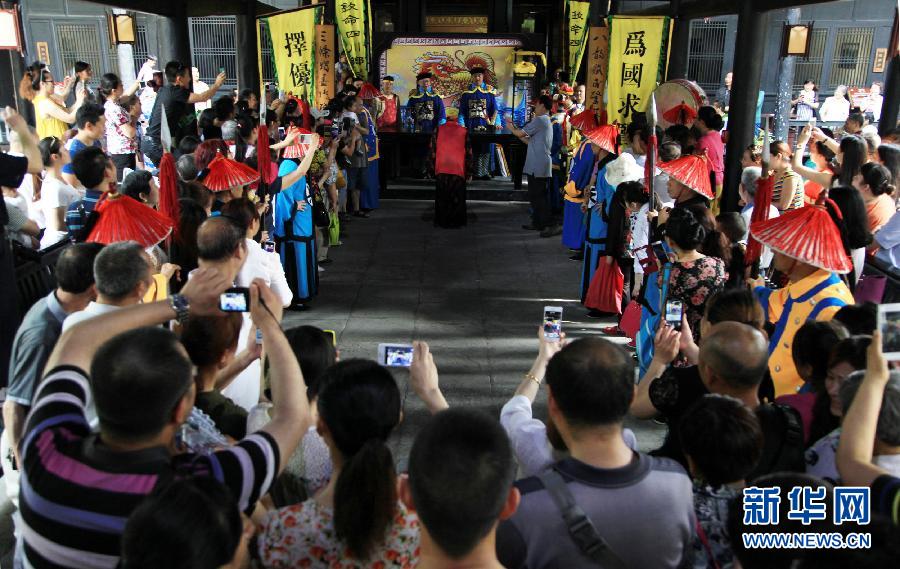 Tourists participate in an interactive activity in Langzhong ancient town, southwest China's Sichuan province, May 19, 2015. Tuesday is China's fifth National Tourism Day. Many scenic spots have taken certain measures and offered discounts to attract more tourists. (Xinhua/Wang Yugui)