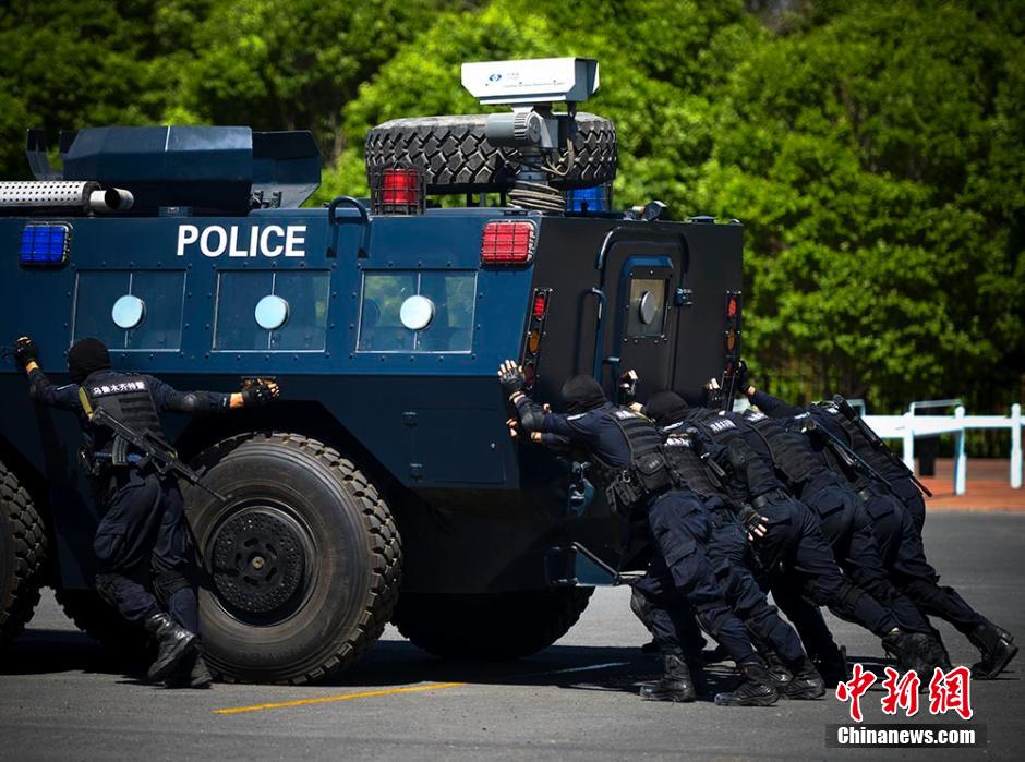 Special police force conducted multi-subject training in Urumqi, northwest China’s Xinjiang Uygur Autonomous Region on May 21, 2015. The training subjects included 110-meter steeplechase, abseiling, physical training, shooting, etc. Established in 2010, the special police force of Xinjiang has played an important role in combating terrorism and maintaining social stability. (Chinanews/Liu Xin)