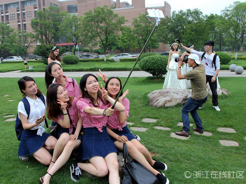 Upon graduation, students wearing various styles of clothes pose for photos to celebrate youth on the campus of Zhejiang Normal University.(Photo/zjol.com.cn)